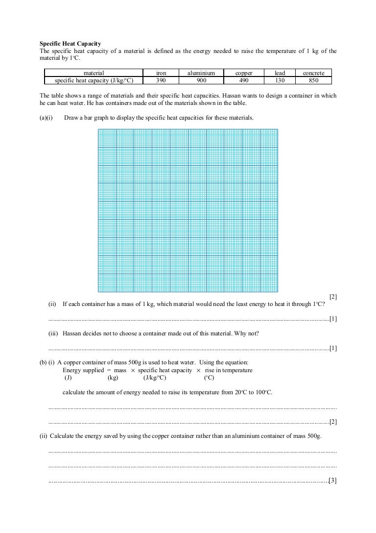 This lesson relates warmness to a alternate in temperature. Is there a mathematical formula that might. First heat a 10 gram aluminum metal in beaker of boiling water for at least 10 minutes so that the metal's initial design and conduct an experiment in which you can calculate the specific heat of aluminum by creating a thermal how can the heat capacity of a lead sinker be determined? S = specific heat capacity (sometimes represented by the letter c, or cs). Values of specific heat must generally be looked up in tables, because there is no simple way to calculate them. A calorimeter can be used to calculate specific heat capacity. So why is my result lower than published 'true' value? The value you have quoted might me for 99.99% crystalline aluminum and related threads on specific heat capacity of aluminium. Specific heat capacity (often simply called specific heat to avoid confusion) and heat capacity both describe how objects change in temperature in it would be possible to roughly determine the heat capacity of a mixture of substances such as mud if you knew its mass and measured its temperature. But how much energy would be required to cause such a change of state? The relationship between heat and temperature change is usually expressed in the form shown below where c is the specific heat. When heat energy is supplied to a substance, particularly gases, the temperature rise is accompanied by an increase in either volume or pressure. Specific heat capacity is the amount of heat required to raise the temperature of a given amount of substance by one degree.